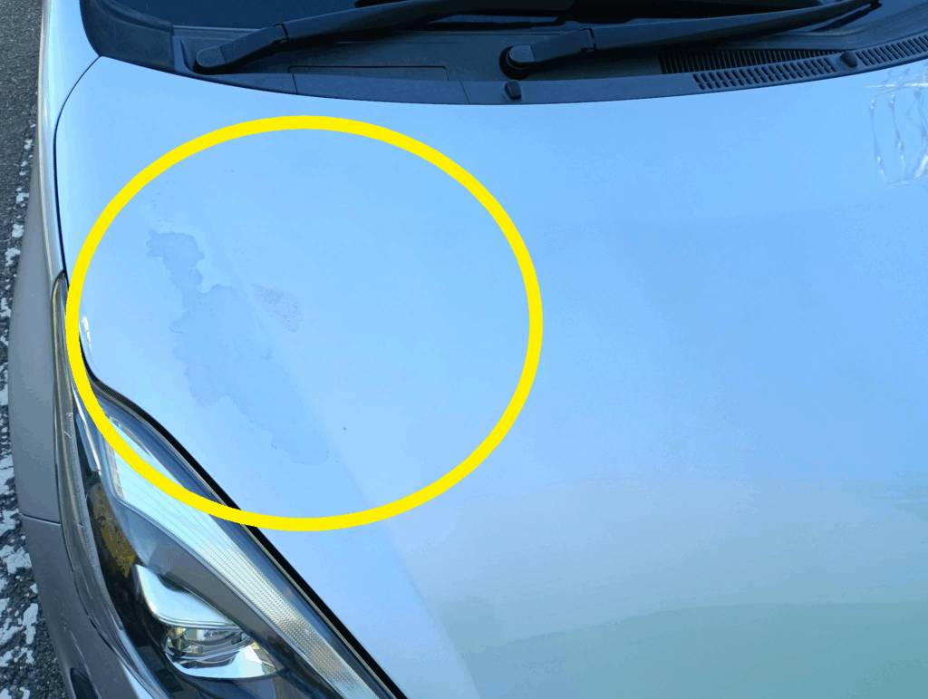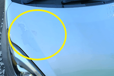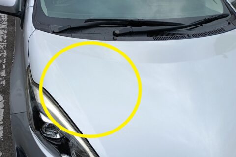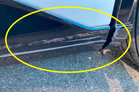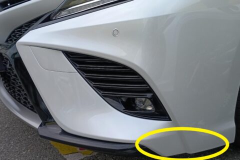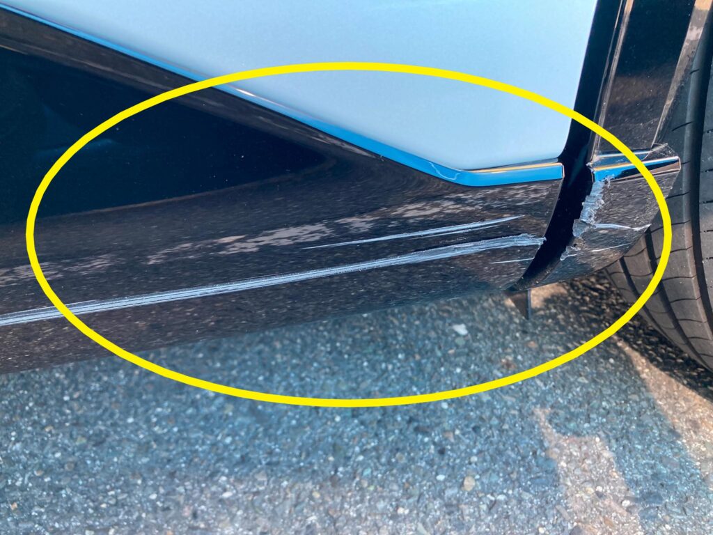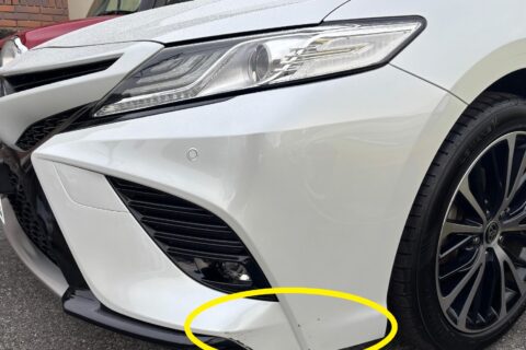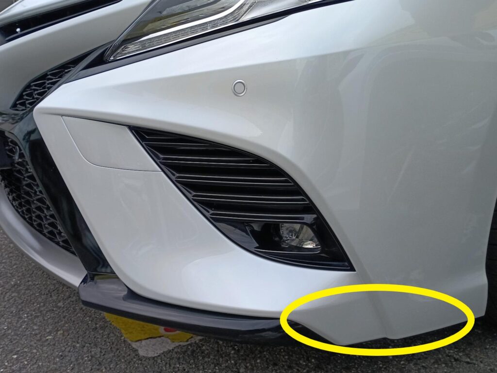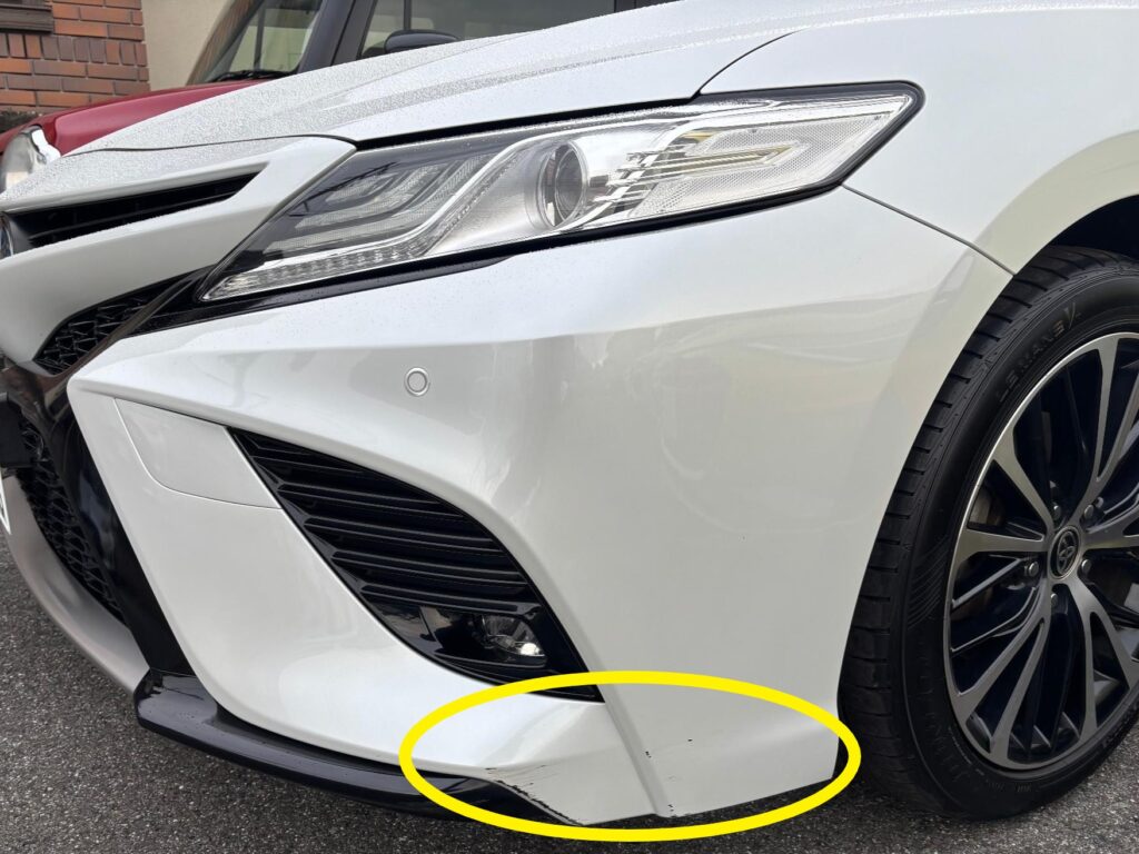 バンパーのボディカラー部分(白)とアクセント部分(黒)の2箇所に渡って傷がついていますが、白い方のみ塗装修理を行いました。